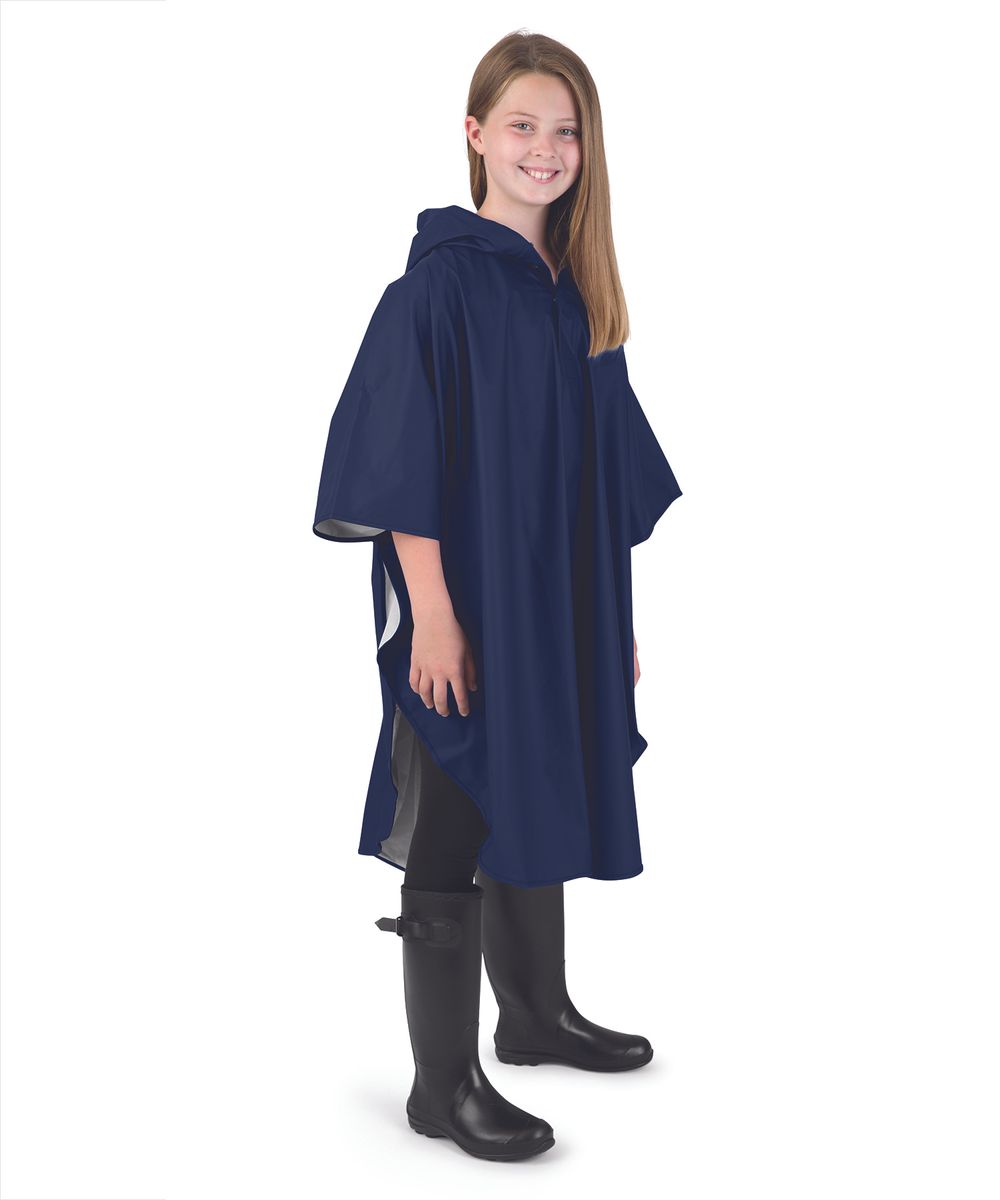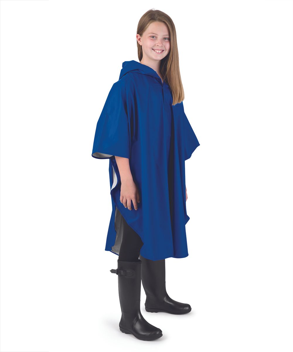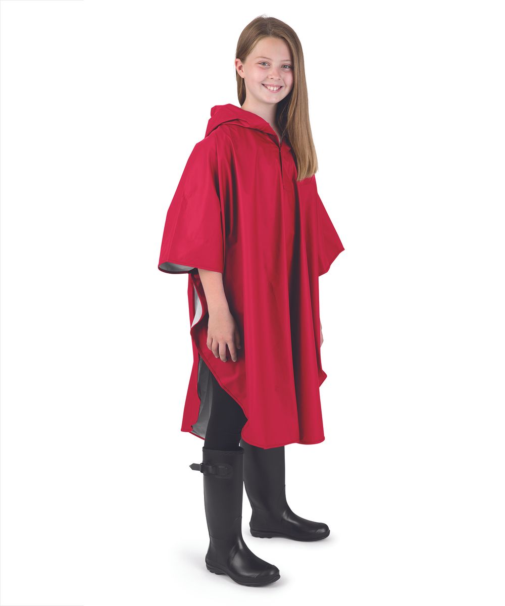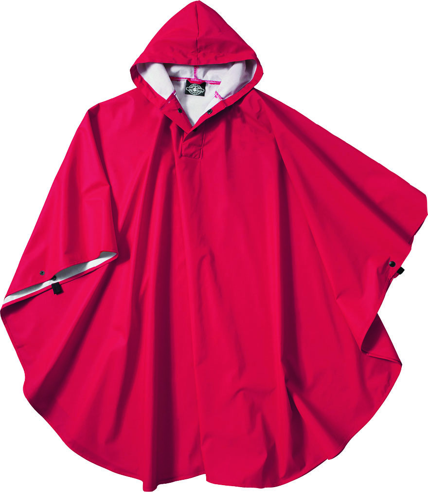 The Youth Pacific Poncho is crafted from high-quality, waterproof New Englander® Polyurethane bonded to a knit backing to provide additional fabric strength. It features heat-sealed seams and hood with drawstrings. Snap placket at neck and side snap closure under arms provide added wind/rain protection. Comes with matching bag.